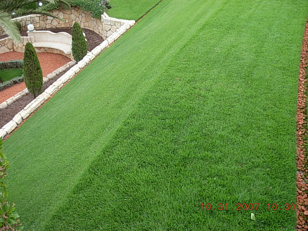 - La zona central de cada terraza ha sido plantada con césped Zoysia, parterres anuales, setos de santolina y duranta, arbustos y árboles podados.