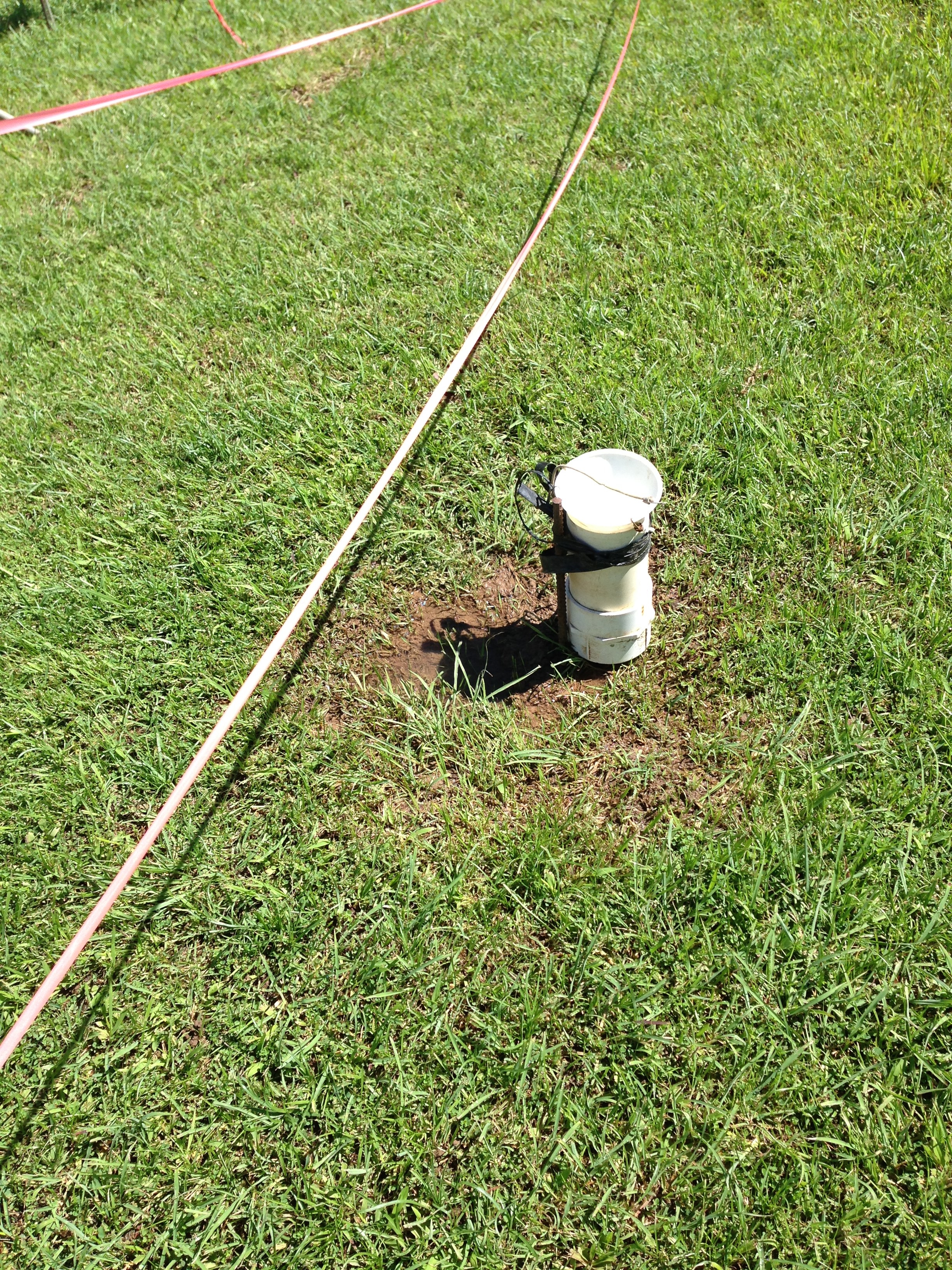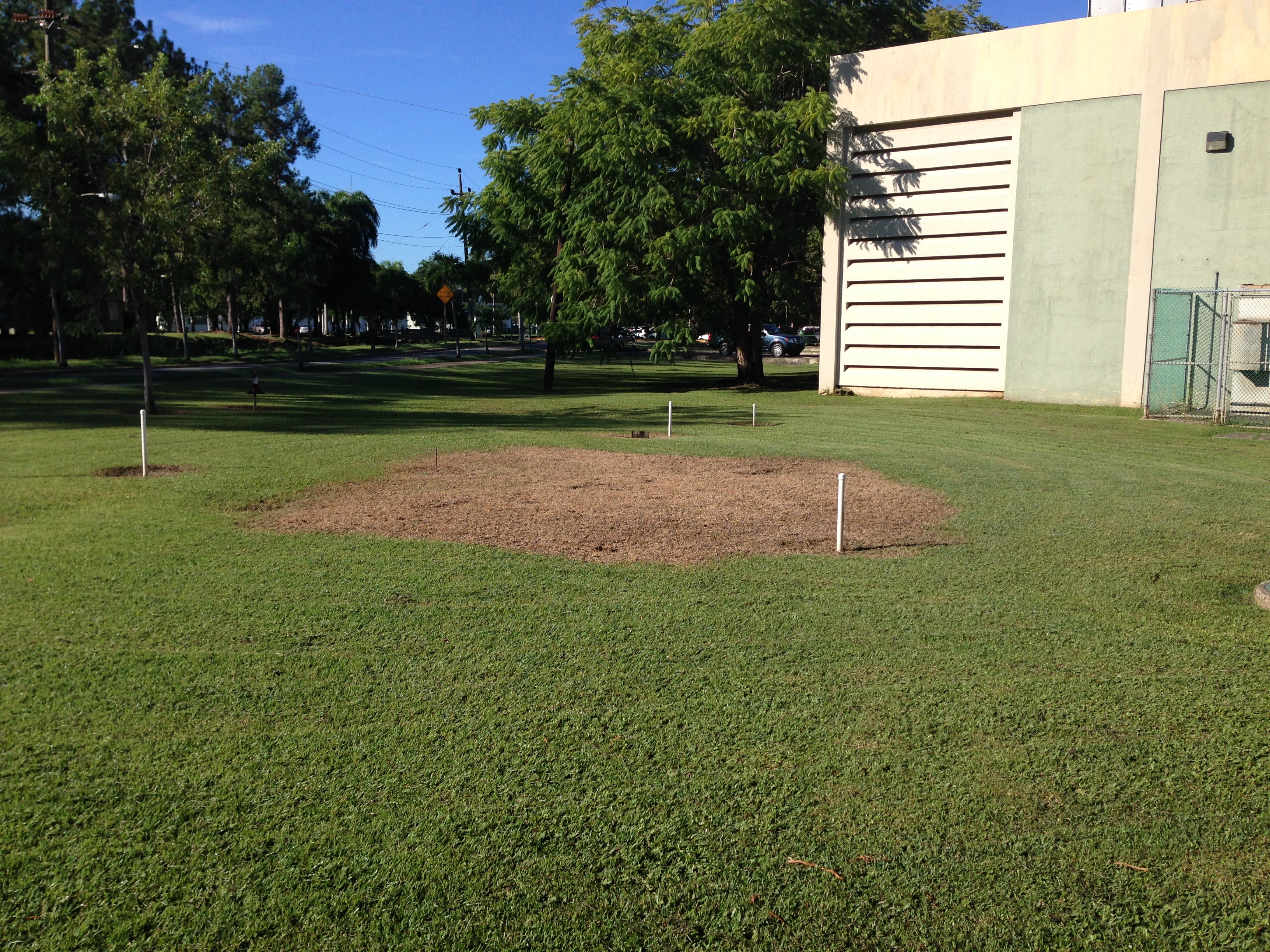 When I informed a couple of the worker about my concern, they agreed not to trim inside the perimeter of the area. But to fulfill their mission, they came back with some type of chemical (Roundup?) and sprayed everything within the perimeter!!!!!!!! OMG!!!! Please stop trying to help me! The two pictures below clearly show the grass dying within the area of the research equipment. It is possible that within a week there will only be brown dirt within the area, I hope not.