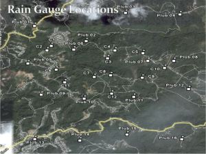 During July 2006, sixteen tipping bucket rain gauges were installed within the area covered by one GOES satellite pixel (4 km x 4 km), with the objective of comparing the gauge data with rainfall estimates from the NOAA NESDIS Hydro-Estimator algorithm and the UPRM CASA Radar network. Each rain gauge is equipped with a data logger capable of storing rainfall depth every 10 minutes over a 48-day period. In 2007, 12 additional rain gauges were added to the network. The 12 gauges are located within a small subwatershed with a stream gauge installed at the outlet. The study area is located near the University of Puerto Rico’s Mayagüez Campus (UPRM) in western Puerto Rico (click on figures below to see enlarged images). For the rain gauge spatial coordinates (Latitude and Longatude) click here. Financial support for installation and maintenance of the rain gauge network is provided by the UPRM NOAA CREST and CASA Radar projects